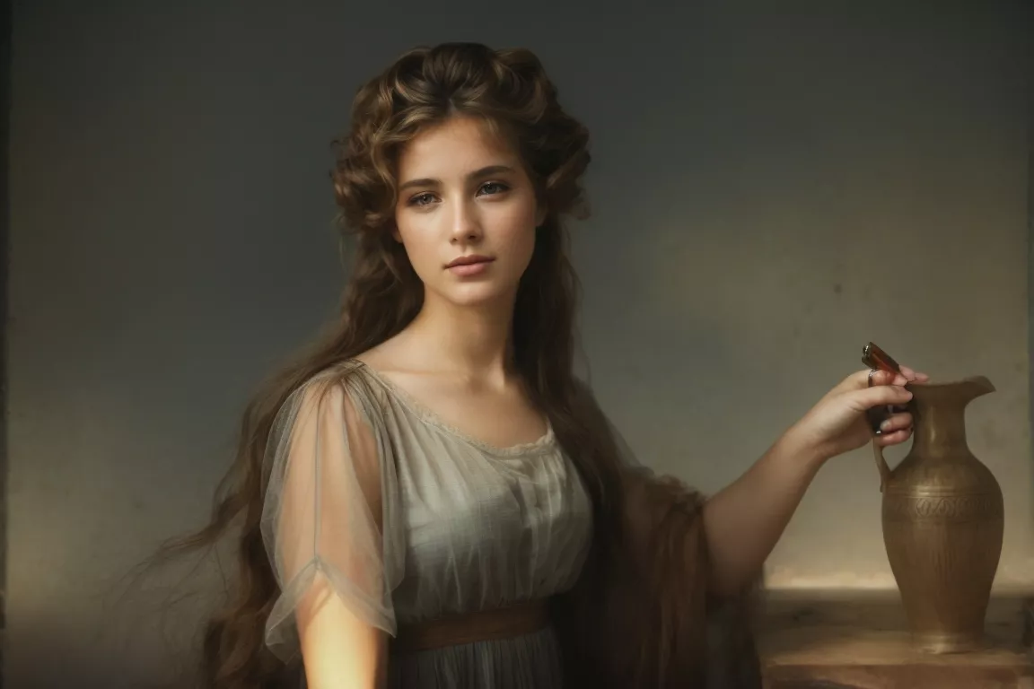 The goddess, materialized in a photorealistic representation, narrates the sacred rituality of wine in ancient Greece, pouring the divine nectar into the chalices of the gods during the sumptuous Olympic banquets.