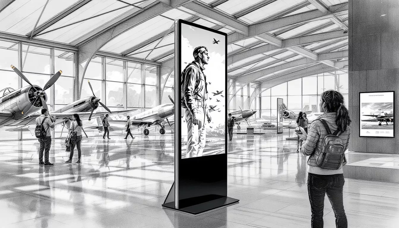 The project involves the implementation of six touch screen totems in the hangars of the MUSAM – Historical Museum of the Italian Air Force , supported by a detailed interactive virtual tour. The 3D simulation accurately illustrates the optimal placement of multimedia stations, complete with technical specifications for connectivity and power.