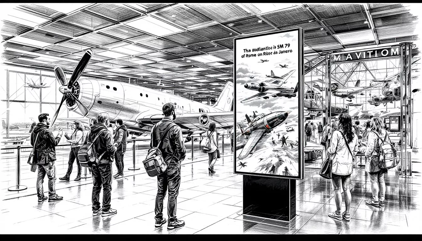 This innovative digital installation created for the MUSAM – Historical Museum of the Italian Air Force commemorates the epic transatlantic flight of the legendary "Green Mice" with the three-engine SM 79 on the Rome-Rio de Janeiro route, through an immersive experience on a touch display.